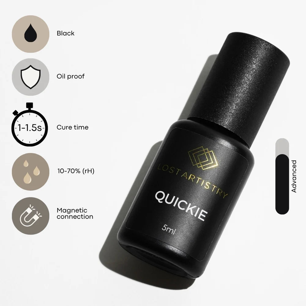 Quickie is Lost Artistry's top-rated lash extension glue for handmade volume — thanks to its ideal balance of instant grip and slight wiggle room. Once you place the fan, it stays put, meaning no slipping or shifting. It’s also fully compatible with classic, handmade, premade, and easy fans, making it an all-around favourite for advanced techs who like a clean, quick set.